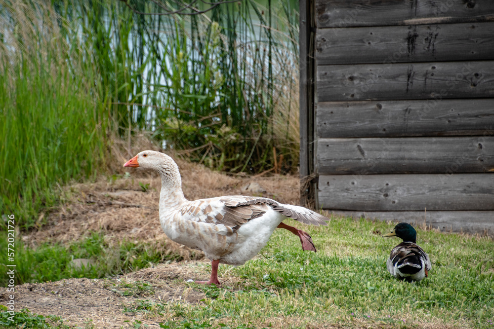 Pregnant Goose Stretching Near Marsh Pond in Oregon