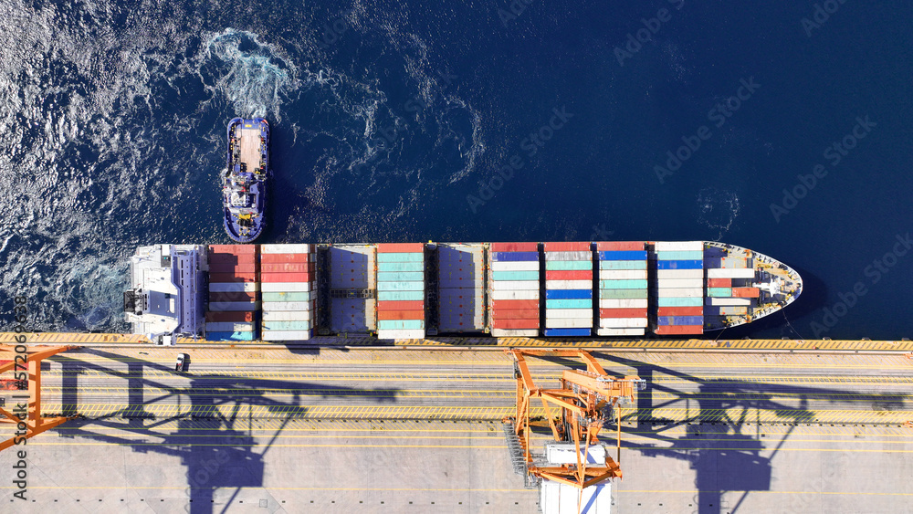 Aerial drone top down photo of container ship guided by tug boat to logistics terminal
