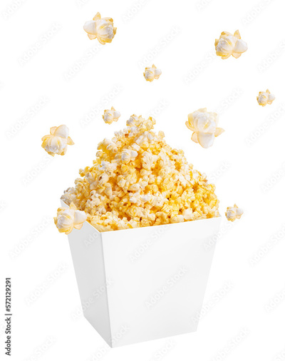 Popcorn bounce out of paper bucket on white background, Popcorn on white background PNG File.