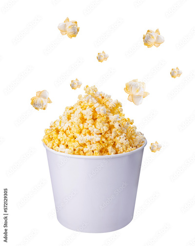 Popcorn bounce out of paper bucket on white background, Popcorn on white background PNG File.