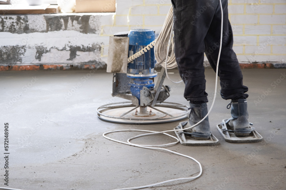 Ramming and grinding of semi-dry floor screed by a machine with a rotating disk for leveling. Construction of a concrete floor in the house, a master with special equipment.