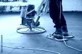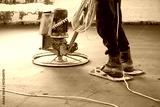 Ramming and grinding of semi-dry floor screed by a machine with a rotating disk for leveling. Construction of a concrete floor in the house, a master with special equipment.