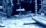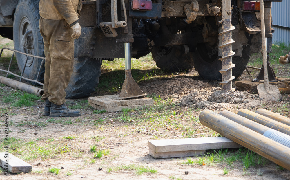 Team of workers with drilling rig on car are drilling artesian well for water in ground. Insertion of metal casing pipe into ground, installation of individual drinking supply, June 28, 2022, Russia,