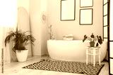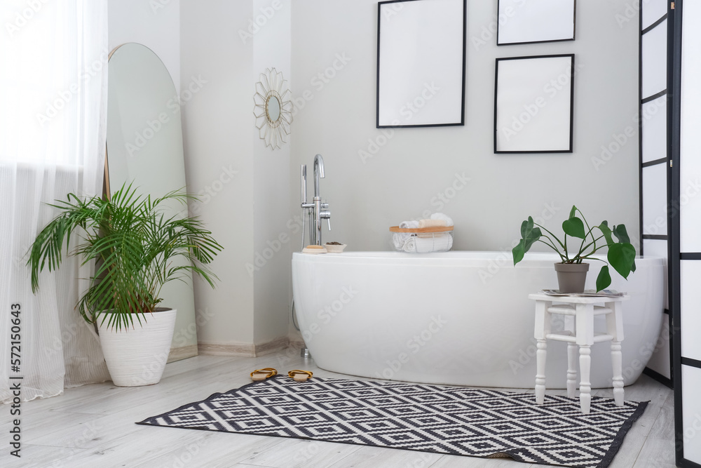 Interior of light bathroom with bathtub, blank frames and houseplants