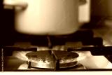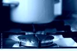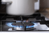 Ignition of the gas burner on the stove in the kitchen. Use of natural resources, economy, cooking on fire. Close-up