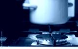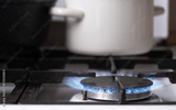 Ignition of the gas burner on the stove in the kitchen. Use of natural resources, economy, cooking on fire. Close-up