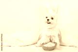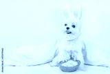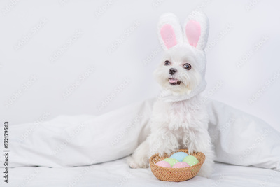 Funny Maltese puppy wearing easter rabbits ears sits with basket of painted eggs on a bed under warm white blanket at home. Empty space for text