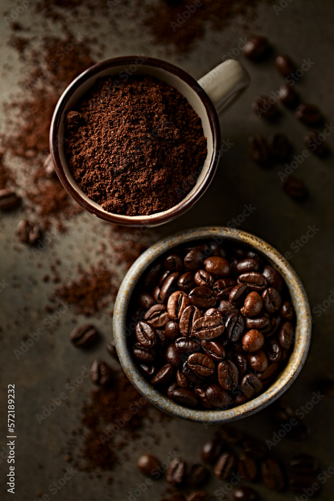 Coffee beans and ground coffee in ceramic cups. Top view. Copy space