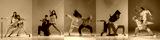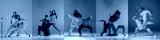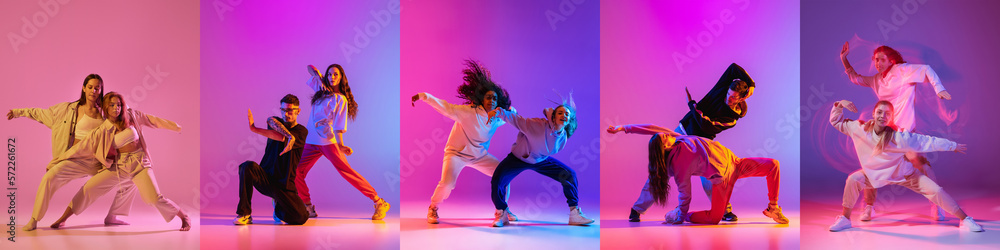 Collage of energetic young hip-hop dancers in motion over multicolored background in neon light. Street style. Concept of music, dance, motion, action, rhytm, youth.