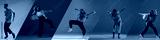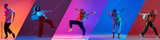 Music in moves. Young expressive contemp dance dancers dancing in neon light. Concept of dance, youth, hobby, dynamics, movement, action, ad. Banner with copy space