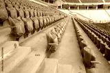 The Olympic Stadium is empty. Empty football stadium - sports events without people. Stadium chair. Numbered steps in a sports stadium between blue plastic seats