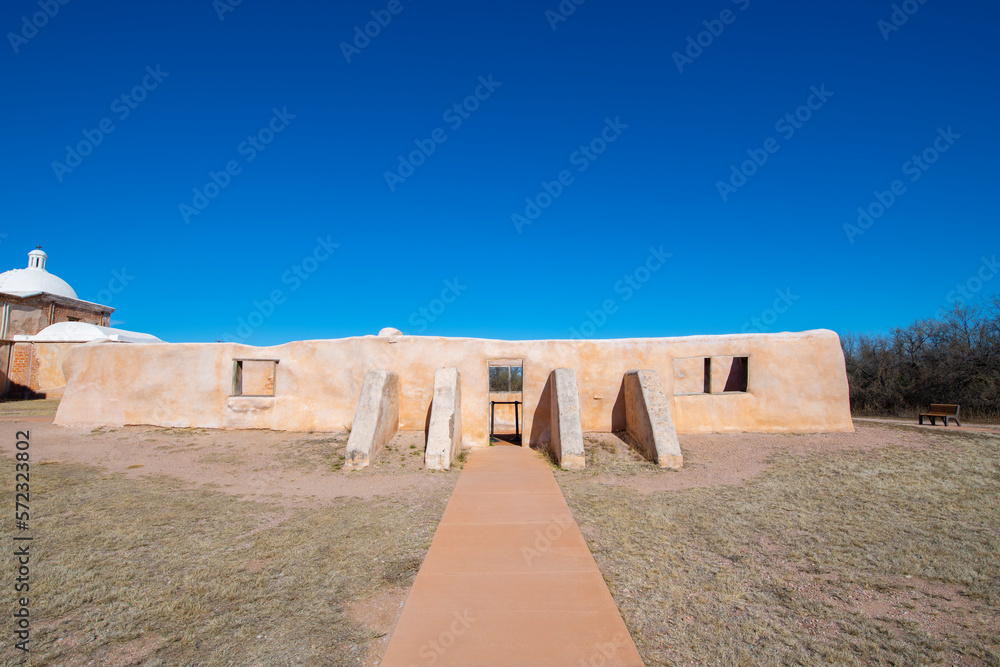 Adobe style house ruin in Tumacacori National Historical Park in Santa Cruz County, Arizona AZ, USA.