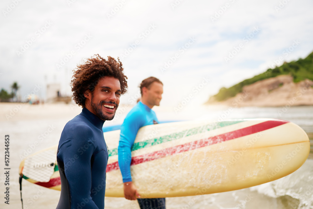 brazilian mid adult surf tutor entering the water with his student to surf the waves in Brazil