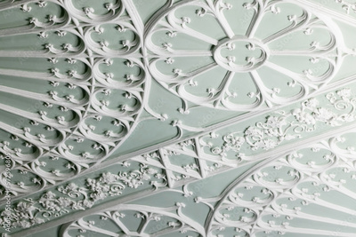Ceiling design details in Gothic style. White gypsum bas-relief