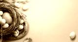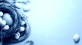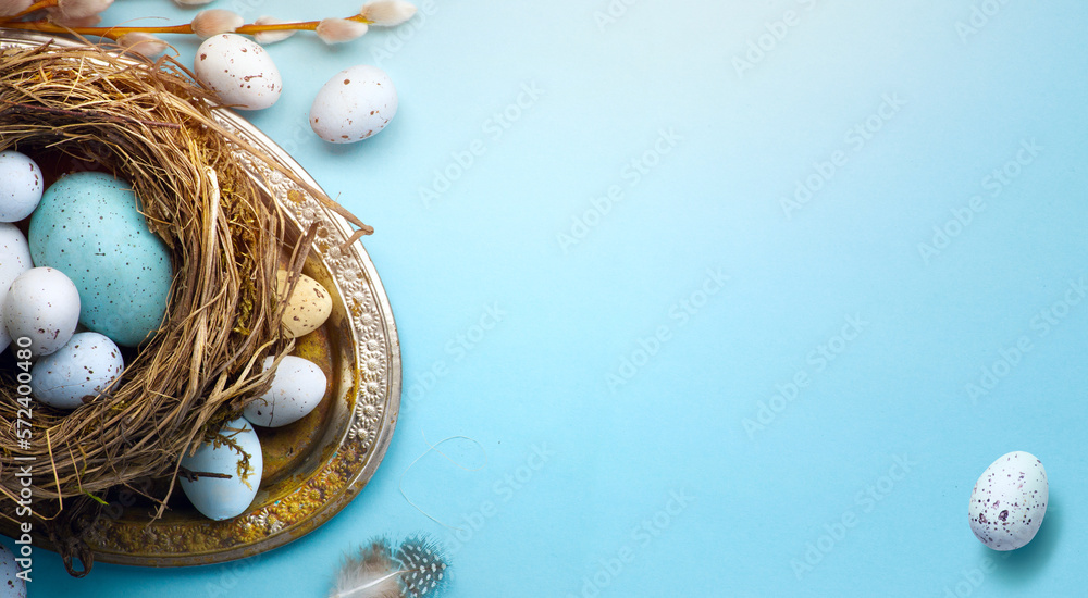 Easter greeting card or banner background with Easter eggs and spring flowers on blue table