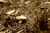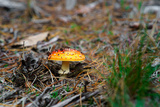 Orange fly agaric growing in the forest undergrowth with a cone lying next to it.