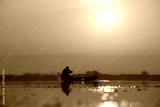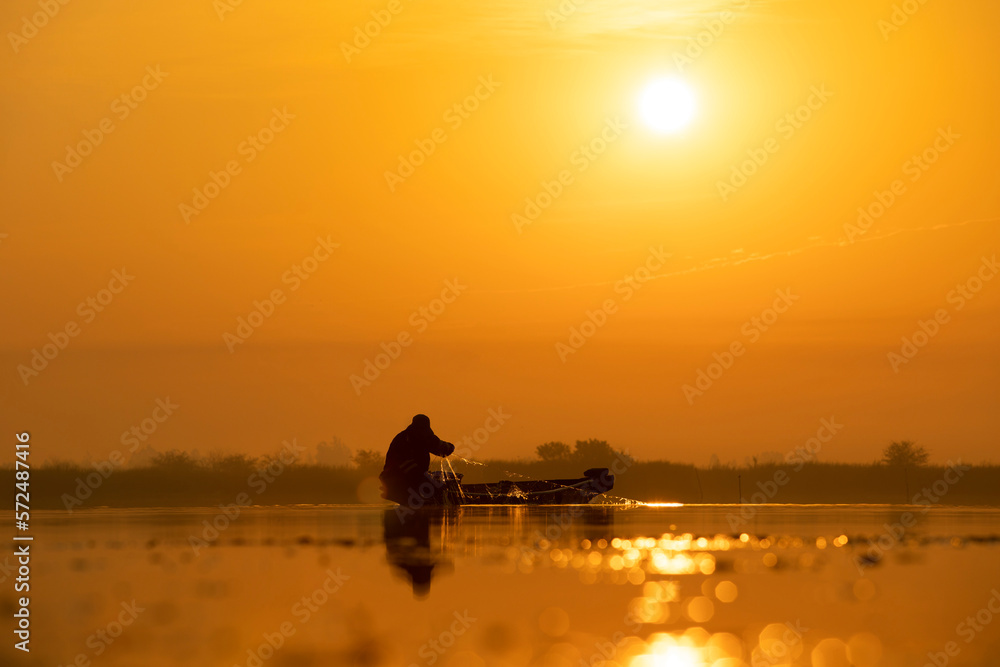 Silhouette of fisherman old man on boat throwing fishing net in lake at sunrise