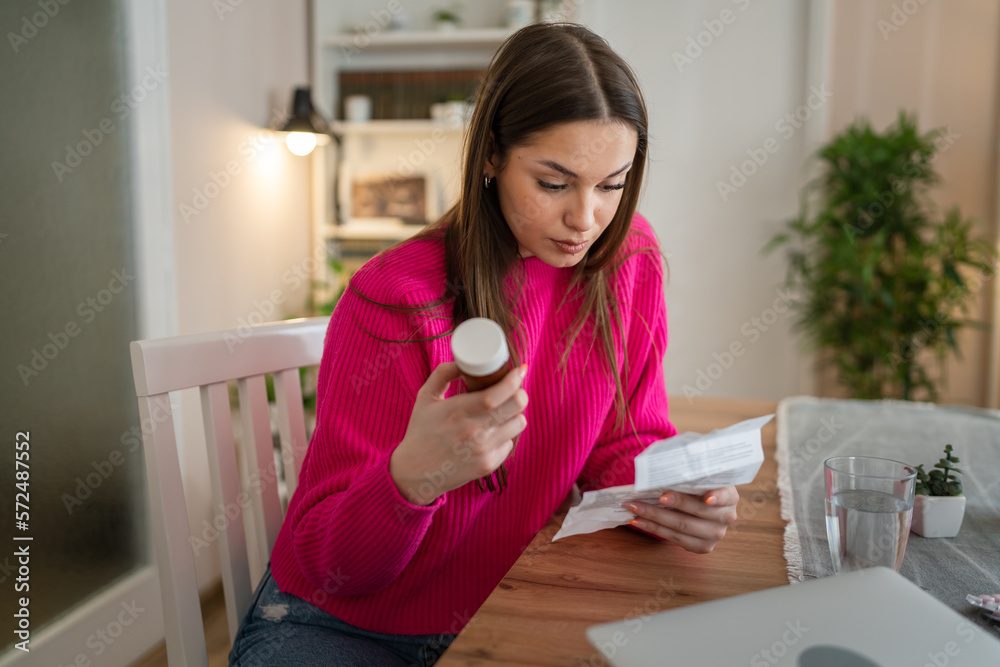 one young woman read medical prescription hold medicine drugs at home