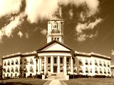 Historic Florida State Capitol Building with brightly colored striped awnings, classical style dome, and American and Florida State Flags in Tallahassee