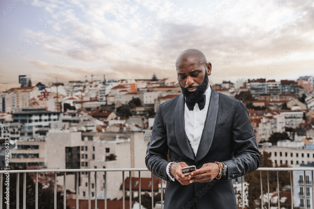 Portrait of a charming and gallant black man, well dressed in a black suit, a bow tie, and a white shirt, this one in a closed semblance looking at his smartphone on a terrace overlooking the city