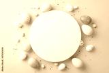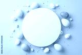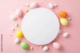 Easter decorations concept. Top view photo of empty white circle colorful easter eggs and sprinkles on isolated pastel pink background with blank space