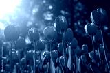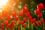 Red tulips lit by sunlight on a flower bed. Landscaping.