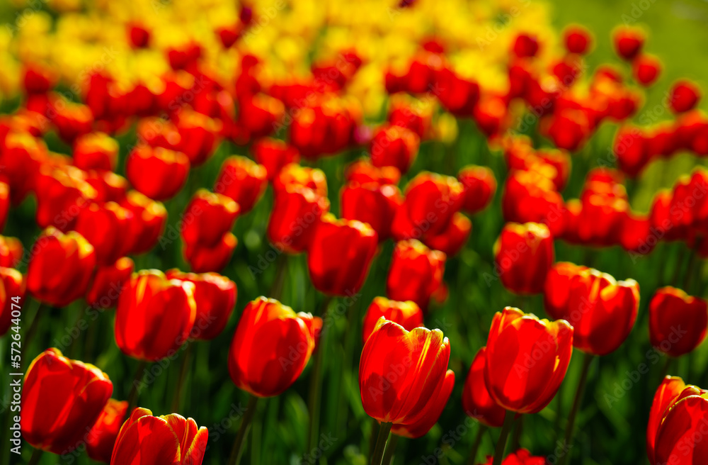Red and yellow tulips lit by sunlight on a flower bed. Landscaping.