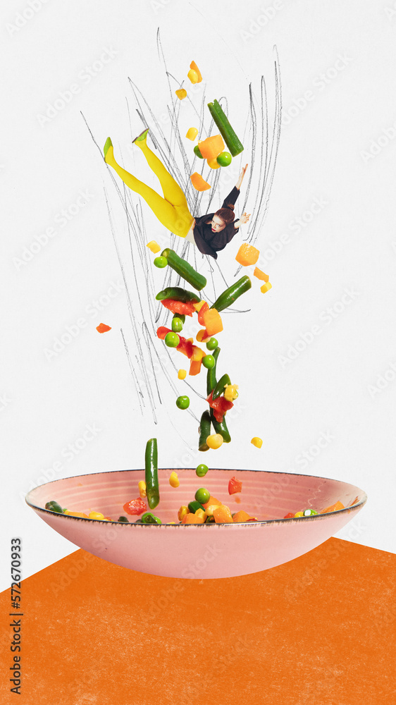 Food pop art photography. Surrealism. New ideas, crazy mood. Contemporary art collage. Concept of creativity, degustation, surreal art, retro style.