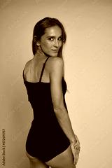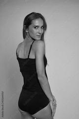 Skinny woman in black underwear turning towards the camera