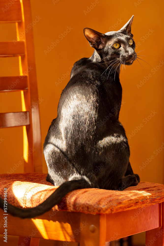 A black oriental cat sits on a chair on orange background.