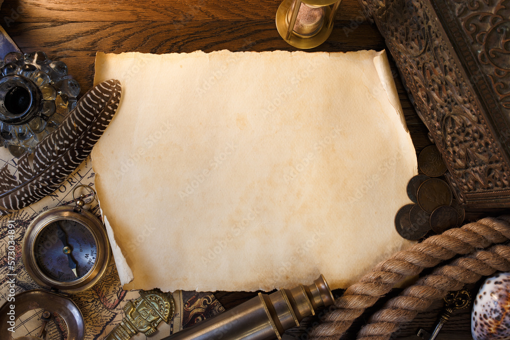 Vintage still life with old paper scroll, spyglass, books, old chest. Adventure and travel concept.