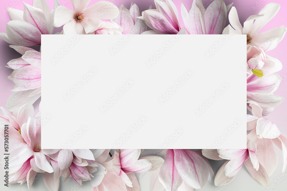 Cartolina rosa con fiori di magnolia, su sfondo bianco