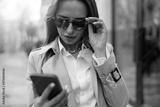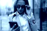 European woman in sunglasses is looking on phone on city street background. High quality photo