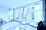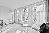 a living room with white walls and wood flooring, two large windows in the wall is covered with sheer curtains