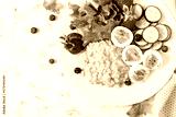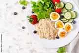 Breakfast oatmeal porridge with boiled eggs, cucumber and strawberry. Healthy balanced food. Top view, flat lay