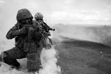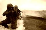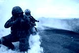 Two soldiers in the war shoot from a machine gun in a smoke curtain