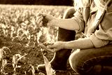 Drought in agricultural field. Farmer holding dry soil in hand and control quality of fertility at arid climate. Impact of climate change on agriculture