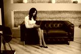 Beautiful slim elegant young indian or arabian business woman sitting on the sofa dnd working remotely from home using laptop