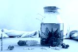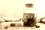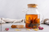 Glass teapot of hot fragrant craft blossom tea with dry rose bud and sugar