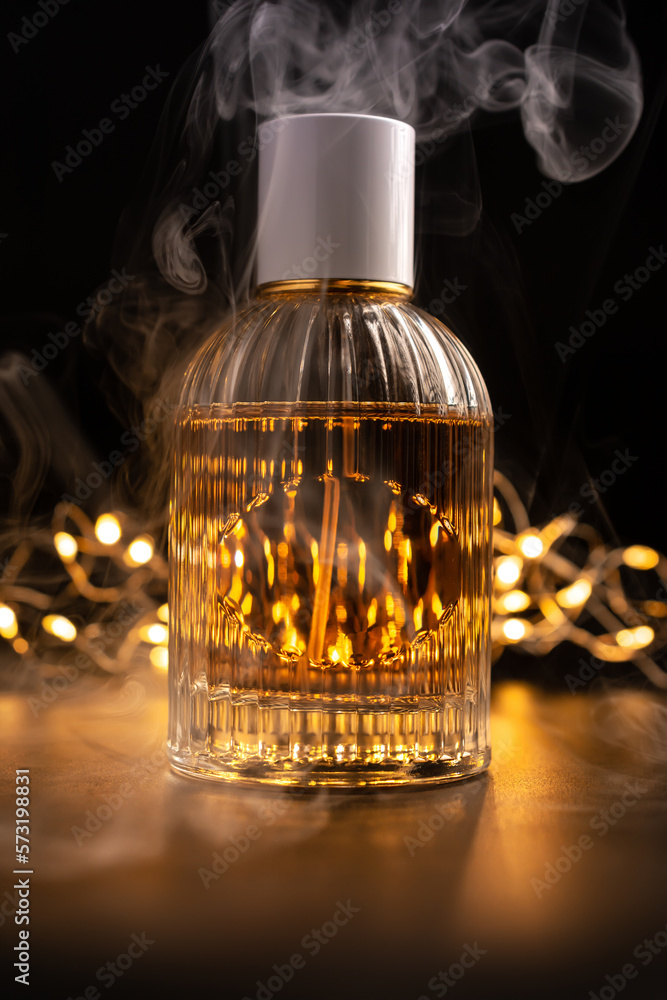 Presentation of perfume product with smoke and lights. Beauty concept