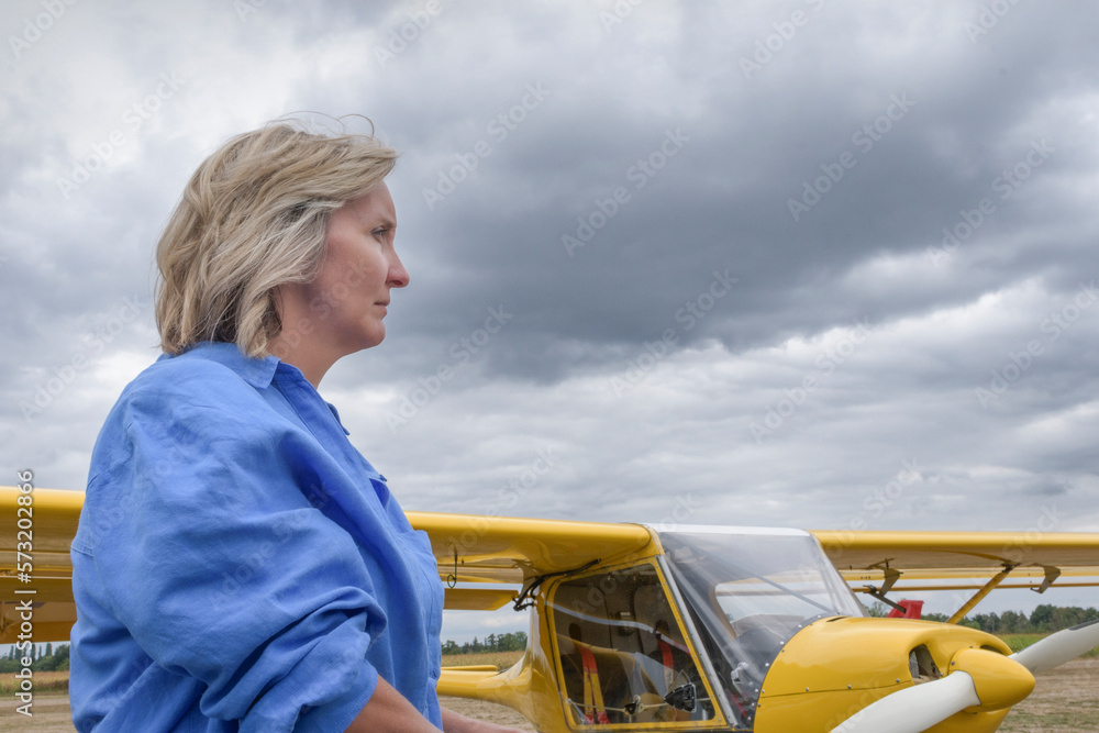 Non-flying weather. A woman on the runway against the backdrop of an airplane. overcast clouds