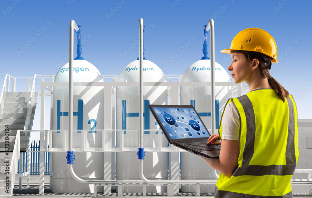 Woman with laptop near hydrogen tanks. H2 energy. Hydrogen renewable energy production. Outdoor storage tanks H2. Eco-friendly power plant employee. Woman studying hydrogen technology
