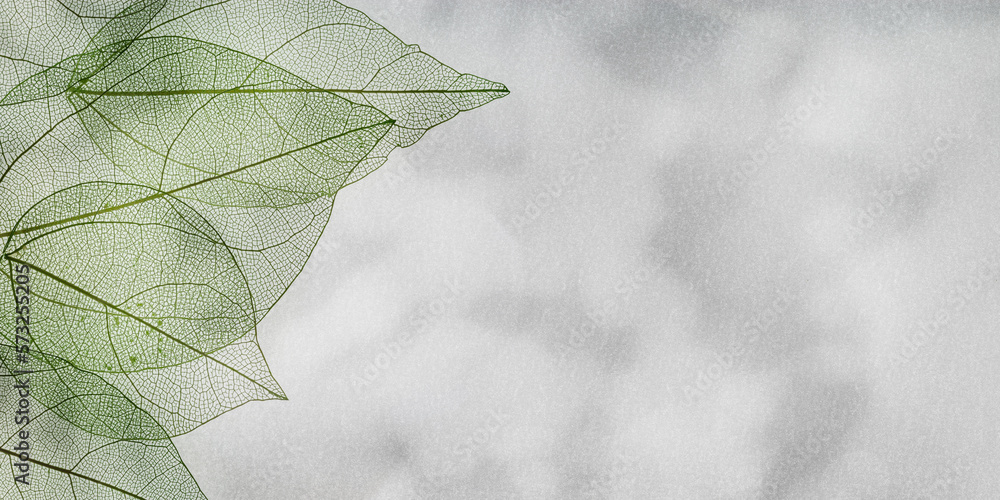 Green skeletonized leaf on soft gray background with sunlight and shadows, wide banner. Beauty nature concept. Botanical pattern, close up transparent leaves, summer, spring green foliage