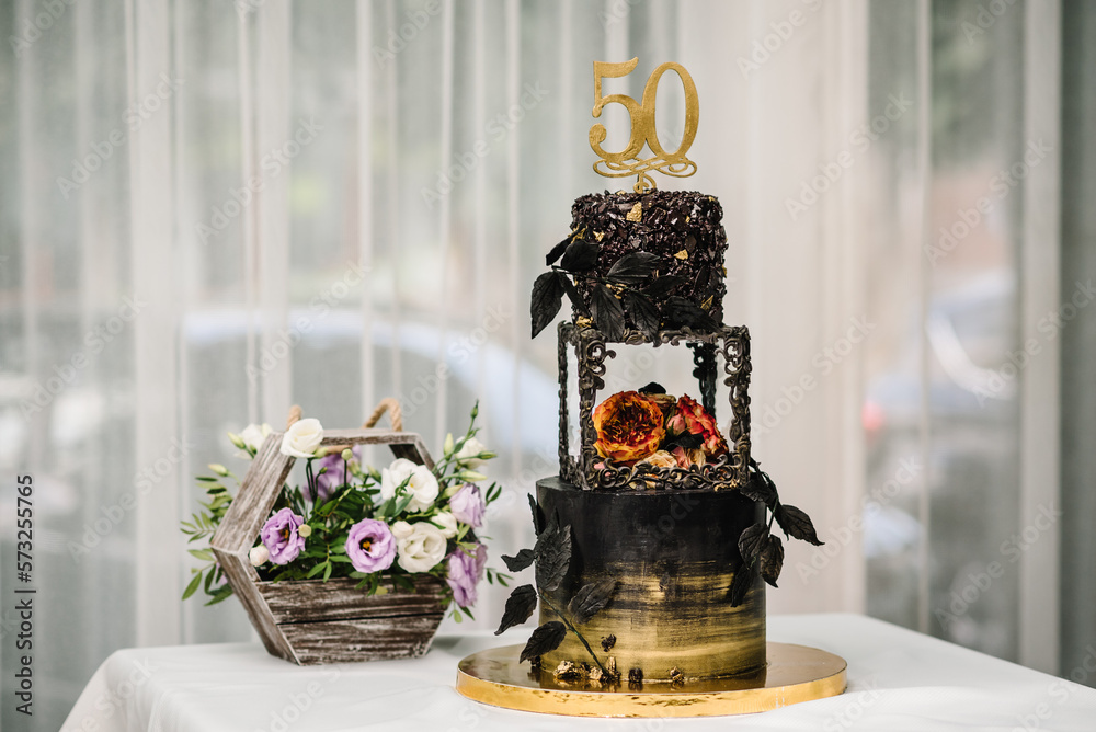 Birthday Cake. Cake for the 50th anniversary of the decorated flowers and gold and black decor. The concept of festive desserts.