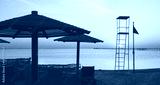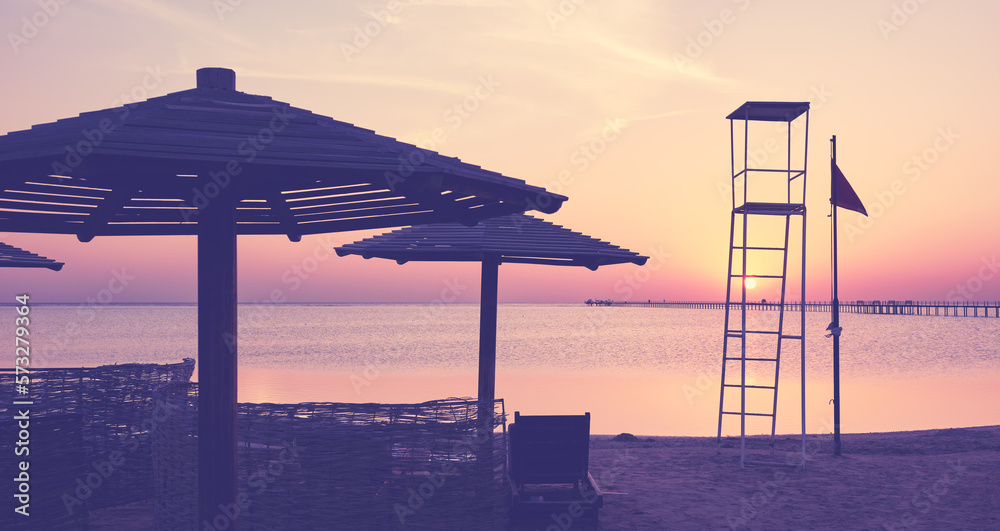 Lifeguard tower silhouette on a tropical beach at sunset, color toning applied, selective focus.