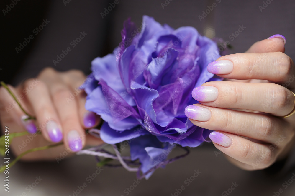 Female hands with violet nail design close-up. Artistic manicure with gradient violet glitter nail polish