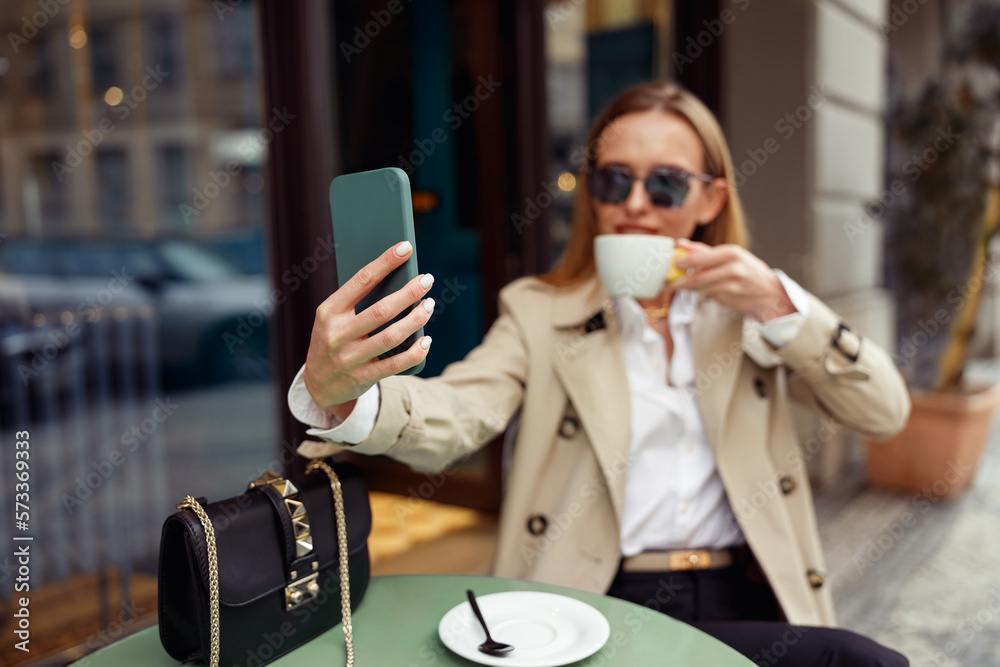 Stylish woman sitting at cafe terrace and taking selfie on phone. High quality photo