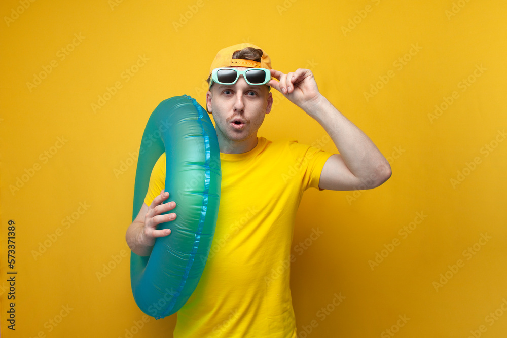 surprised guy tourist in summer clothes and glasses holds a swim ring and wonders, vacation travel concept