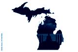 Outline of the state of Michigan with a boy sitting on a dock stargazing at night.