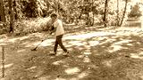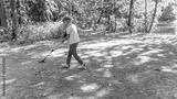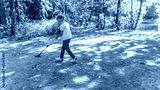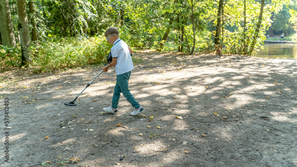 serious boy with a metal detector examines the soil on a rocky trail on a summer evening